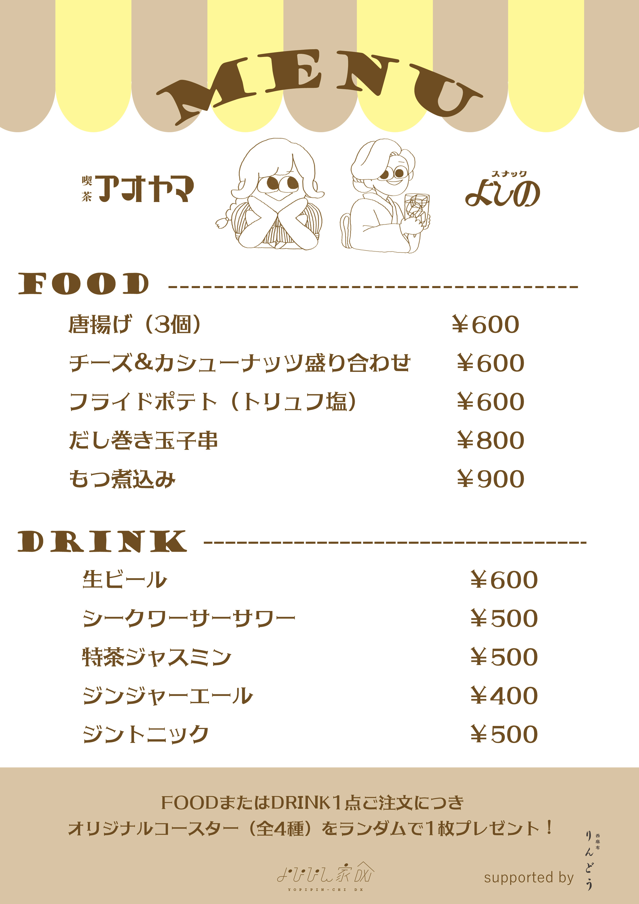 *フードまたはドリンク1点ご購入につきオリジナルコースター(全4種)をランダムで1枚プレゼント